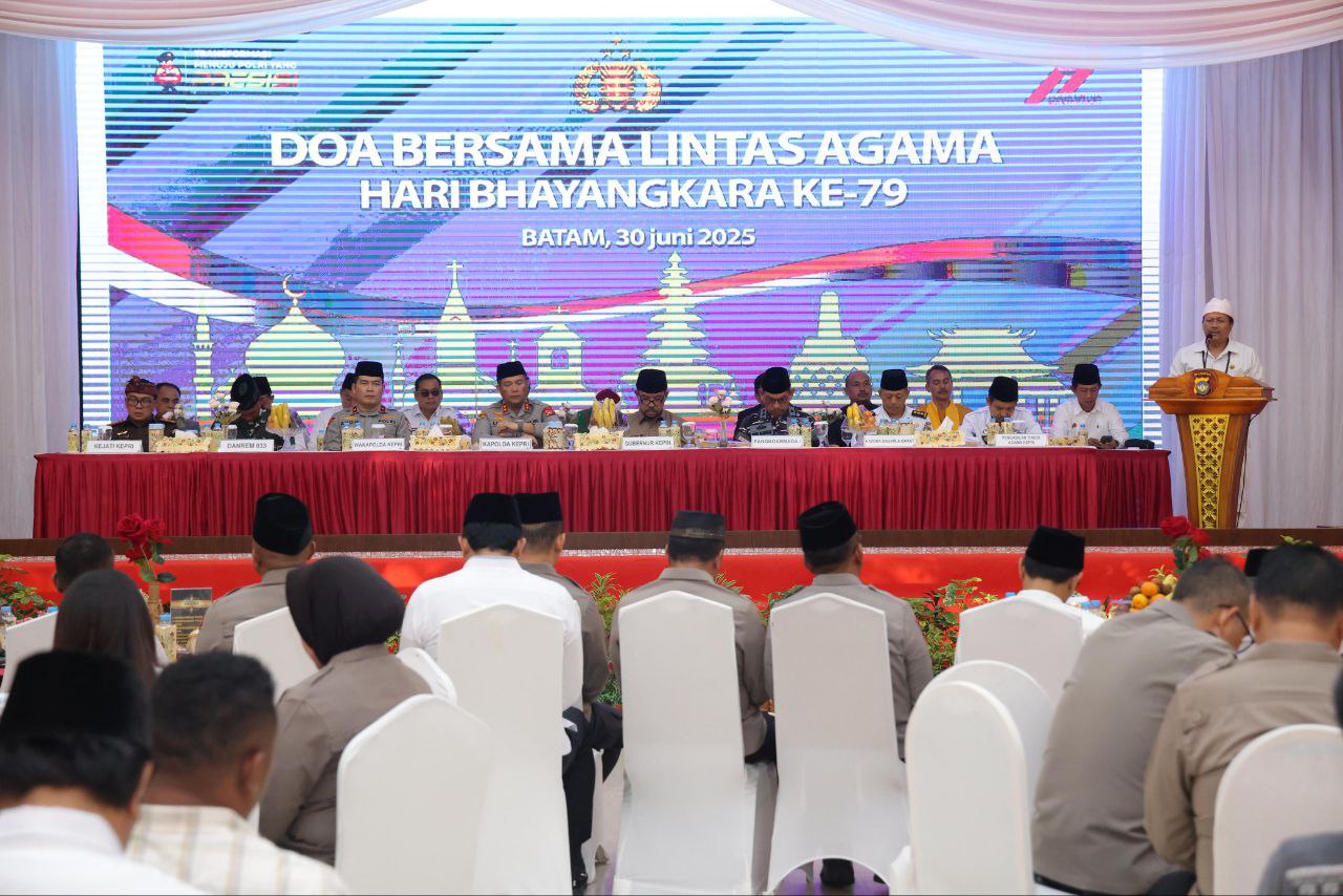 dok Polda Kepri							    Batam – Dalam rangka memperingati Hari Bhayangkara ke-79, Polda Kepulauan Riau menggelar Doa Bersama Lintas Agama bertempat di Gedung Lancang Kuning, Senin (30/6/2025). Kegiatan ini menjadi wujud rasa syukur sekaligus penguatan sinergi antara Polri dengan tokoh agama serta seluruh elemen masyarakat untuk menciptakan suasana yang kondusif dan harmonis di wilayah Kepulauan Riau.
